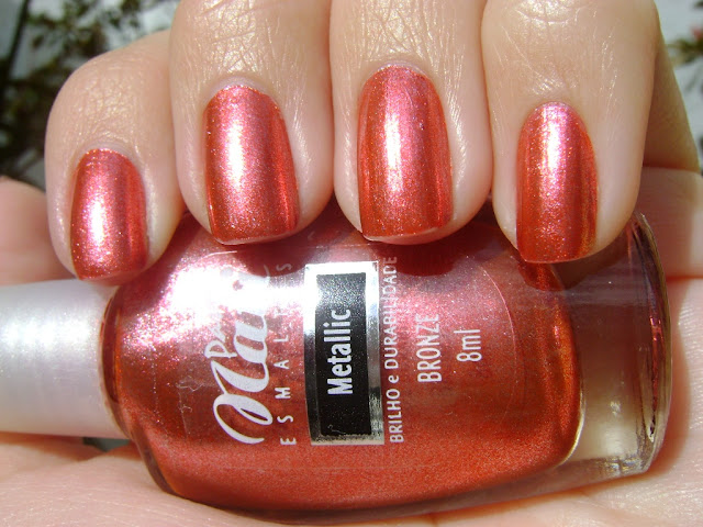 Vocês gostam de esmaltes metálicos/cromados? Eu, até outro dia, torcia o nariz, mas agora acho muito lindo! Usei há um tempo atrás o Bronze, da Passe Nati, que eu esperava que tivesse mais cor de bronze (tipo, medalha de bronze), mas, na verdade, é um vermelho cromado liiiindo! Parece papel alumínio colorido (isso existe?).